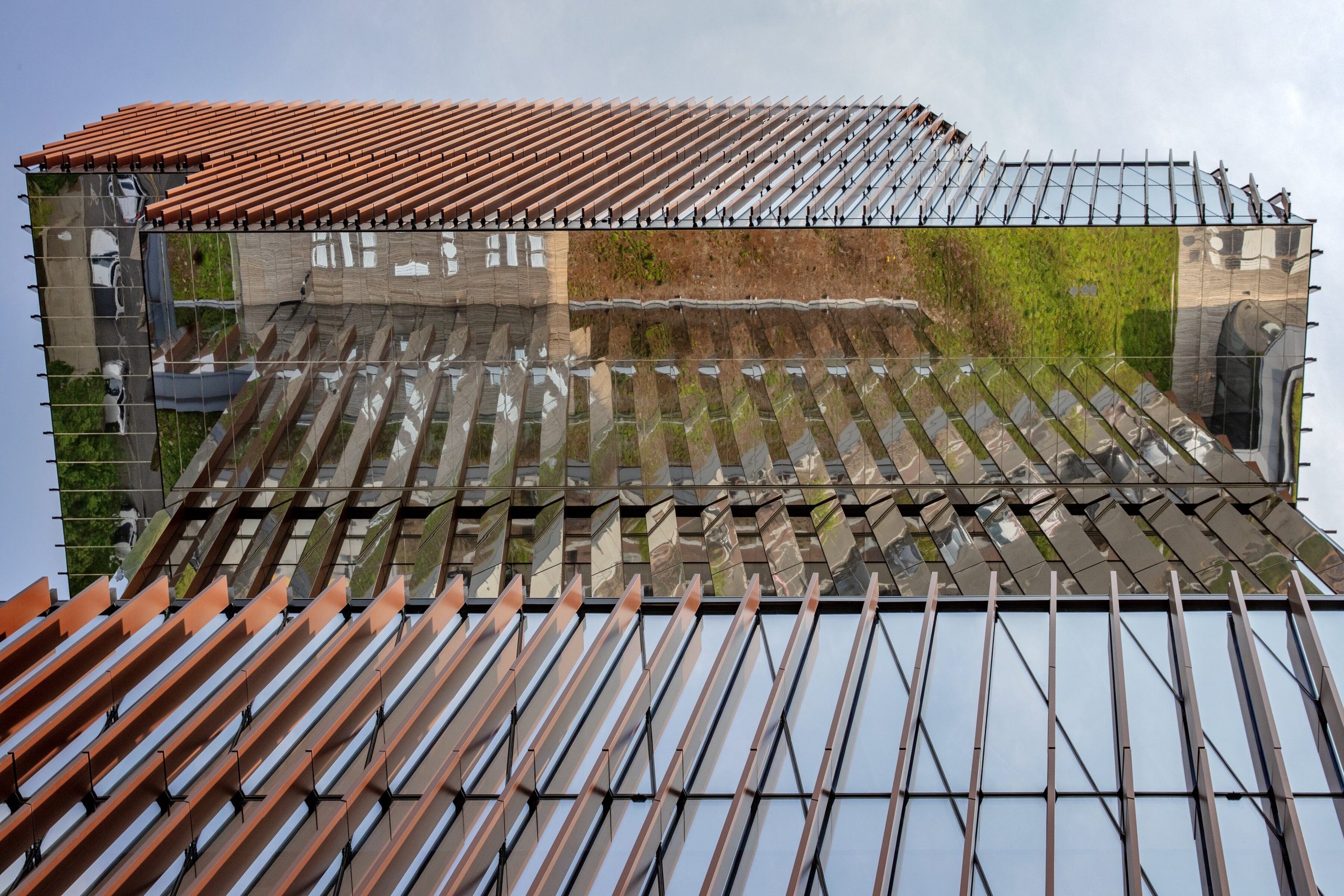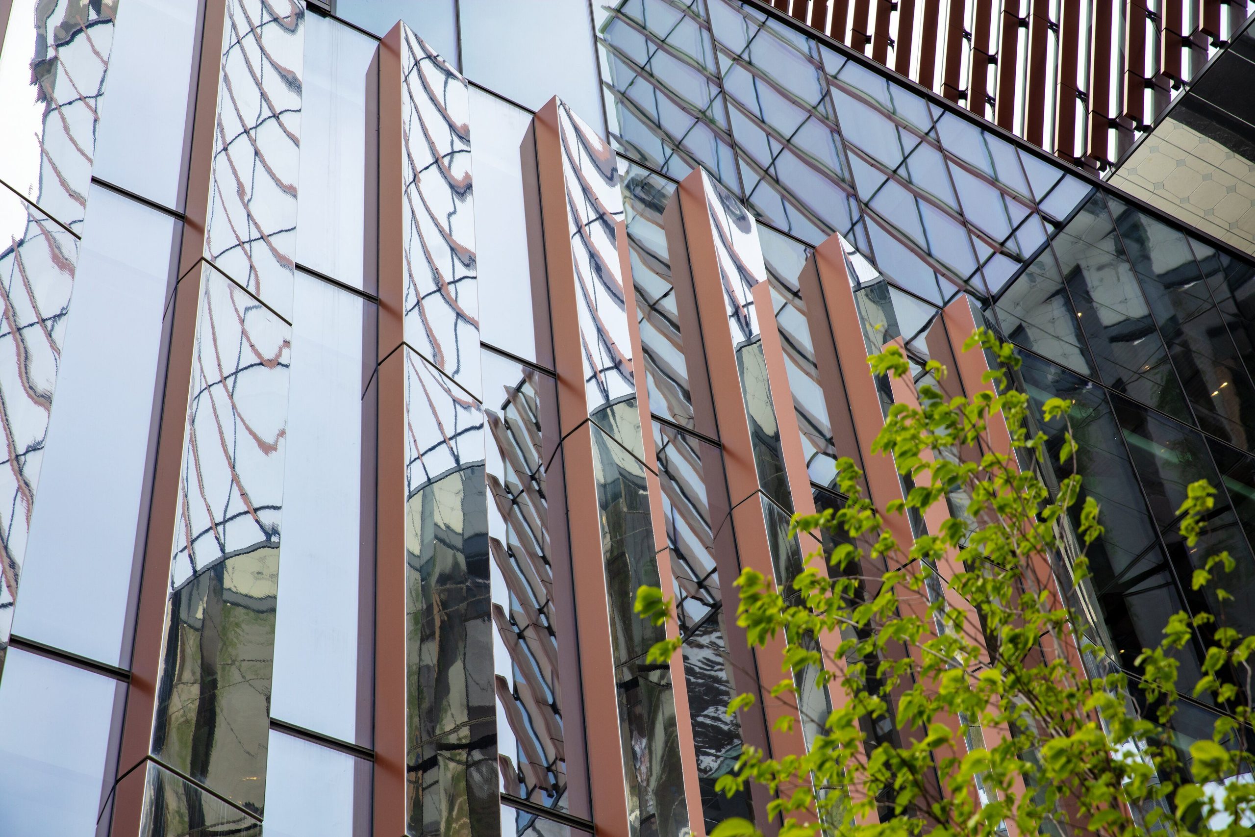 Specialized Metal Fabricators fabricated and Ferguson Neudorf Glass installed 88, 291 square feet of Reynobond® 4mm FR Composite Material in Brite Mirror and a custom Colorweld® 500 Russet Pearl finish to achieve both aesthetic and performance targets. The material is lightweight, durable, and consists of two sheets of coil-coated aluminum laminated on both sides of a core material. It is highly formable and integrates seamlessly into curtain walls, providing an ideal solution to this boundary-pushing build.