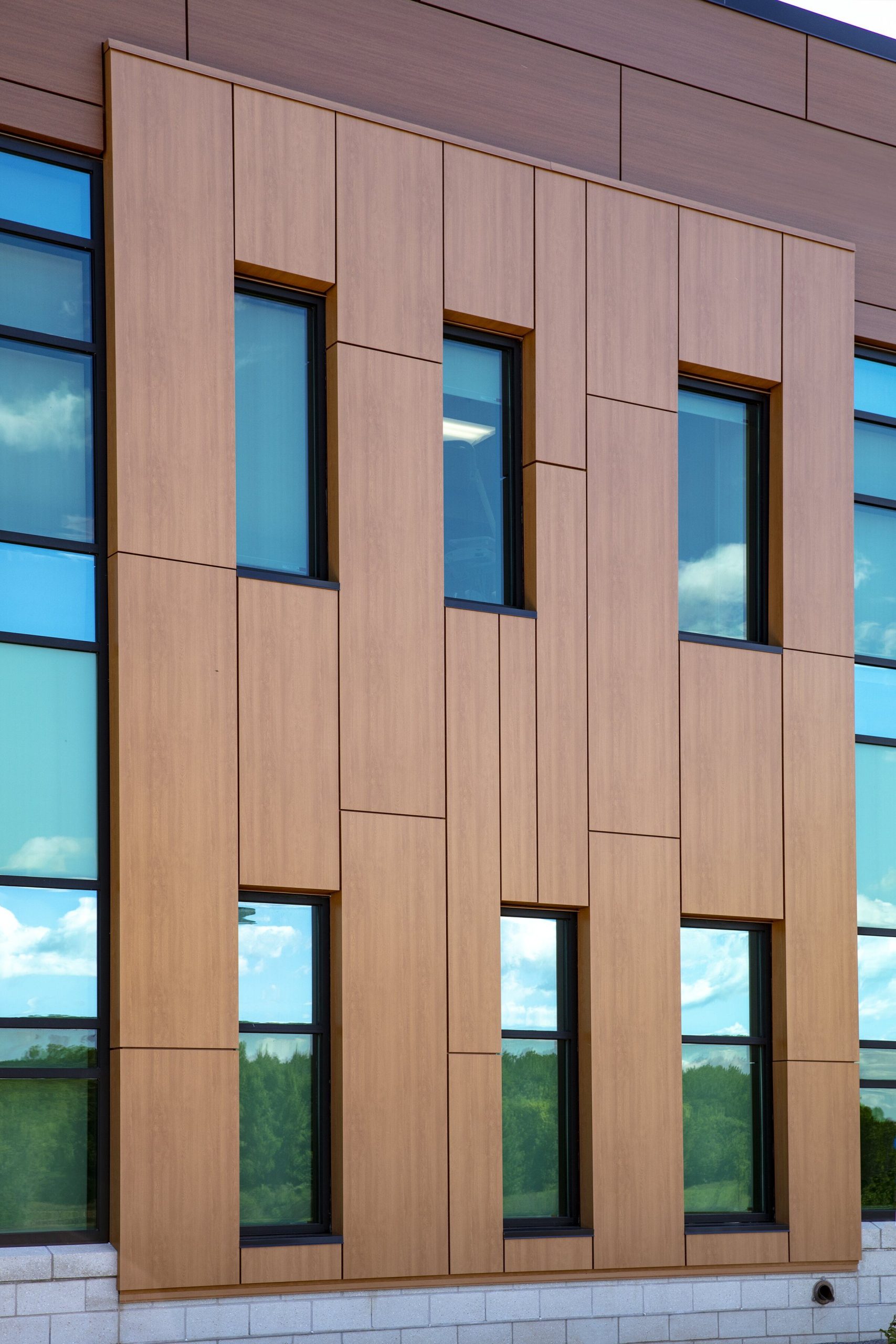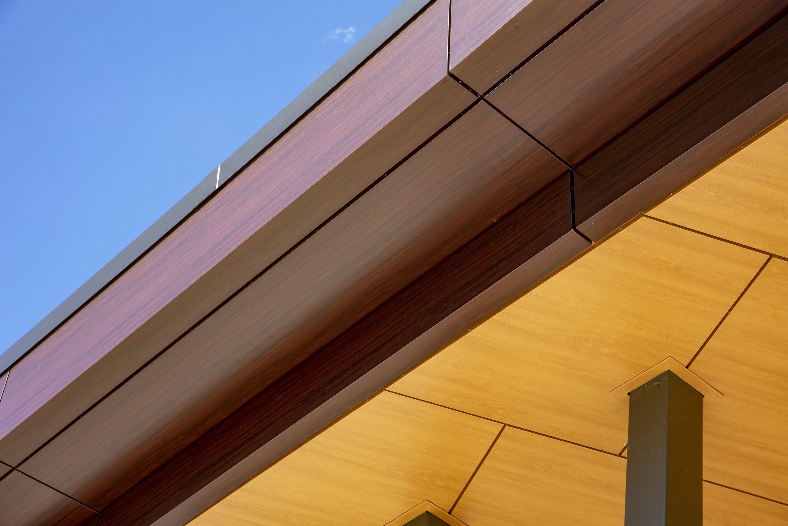 Progressive Building Systems fabricated and installed 38,431 square feet of Reynodual® in three Design Line™ finishes – Scottish Oak, Mahogany Brown and Aciero Corten. The panels are affixed to various parts of the building using a dry-joint system. Hoover Architectural Solutions’ Bonded Sheet allowed for large panels for both the route and return leg. This allowed for faster fabrication and easy installation without any damage to the panels due to the protective film.