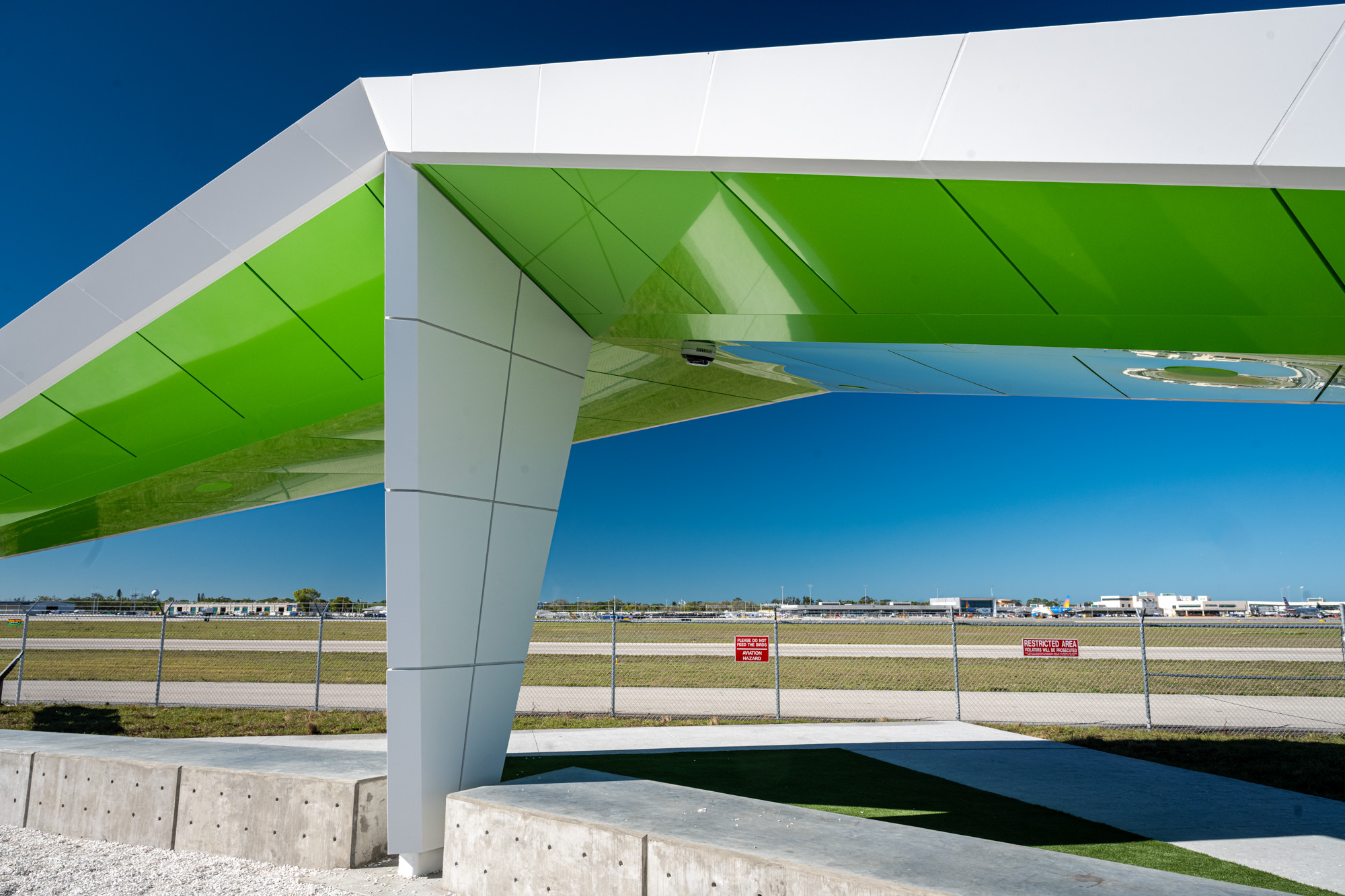 A standout feature of the $2.36 million development is the striking wing-shaped canopy, clad in Reynobond® 4mm FR Aluminum Composite Material (ACM) in Bone White and Regions Green. Fabricated and installed by Mullet’s Aluminum Products Inc, the high-performance panels support the shade’s evocative design, providing visual impact and durability in Florida’s coastal climate.