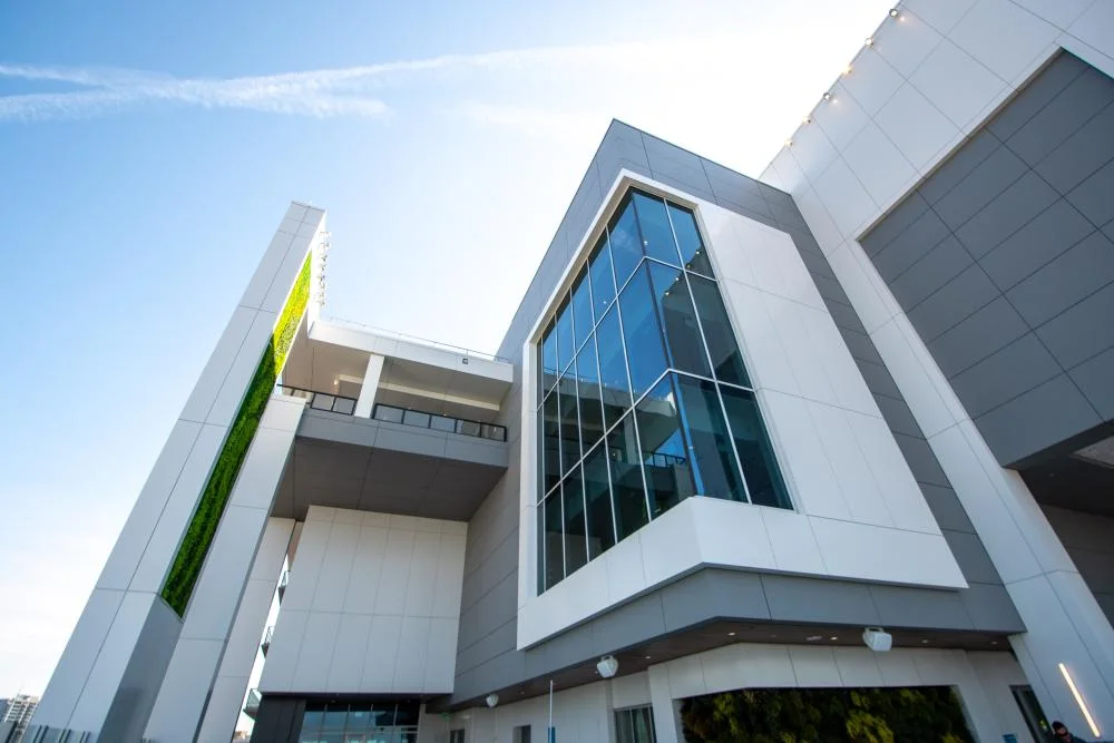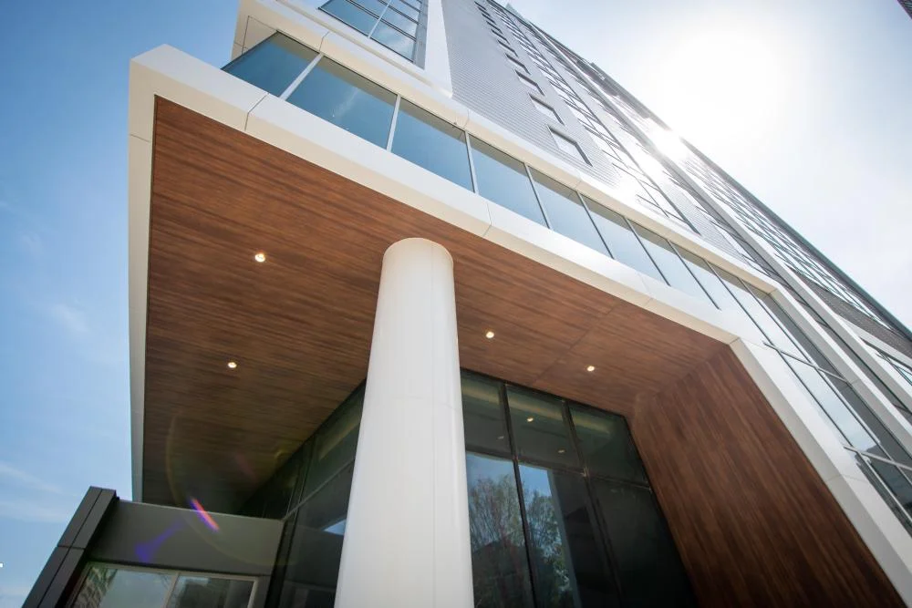 The island themed vacation club boasts spectacular glass walls that reflect Atlanta’s most iconic landmarks. Superb layout and design contributed to the seamless flow of pedestrian traffic in the area, inviting visitors to stroll along the adjacent sidewalks and revel in the city’s exceptional skyline. To achieve the tropical aesthetic design of the property, MillerClapperton fabricated and installed 110,000 square feet of Reynobond® 4mm FR Composite Material, an excellent choice for design flexibility exemplified by this project. The chosen finishes of Bone White, Zinc Patina, Nightfall Metallic, and Cruising Blue perfectly enhance the modern and striking aesthetic of the Wyndham-Margaritaville property.